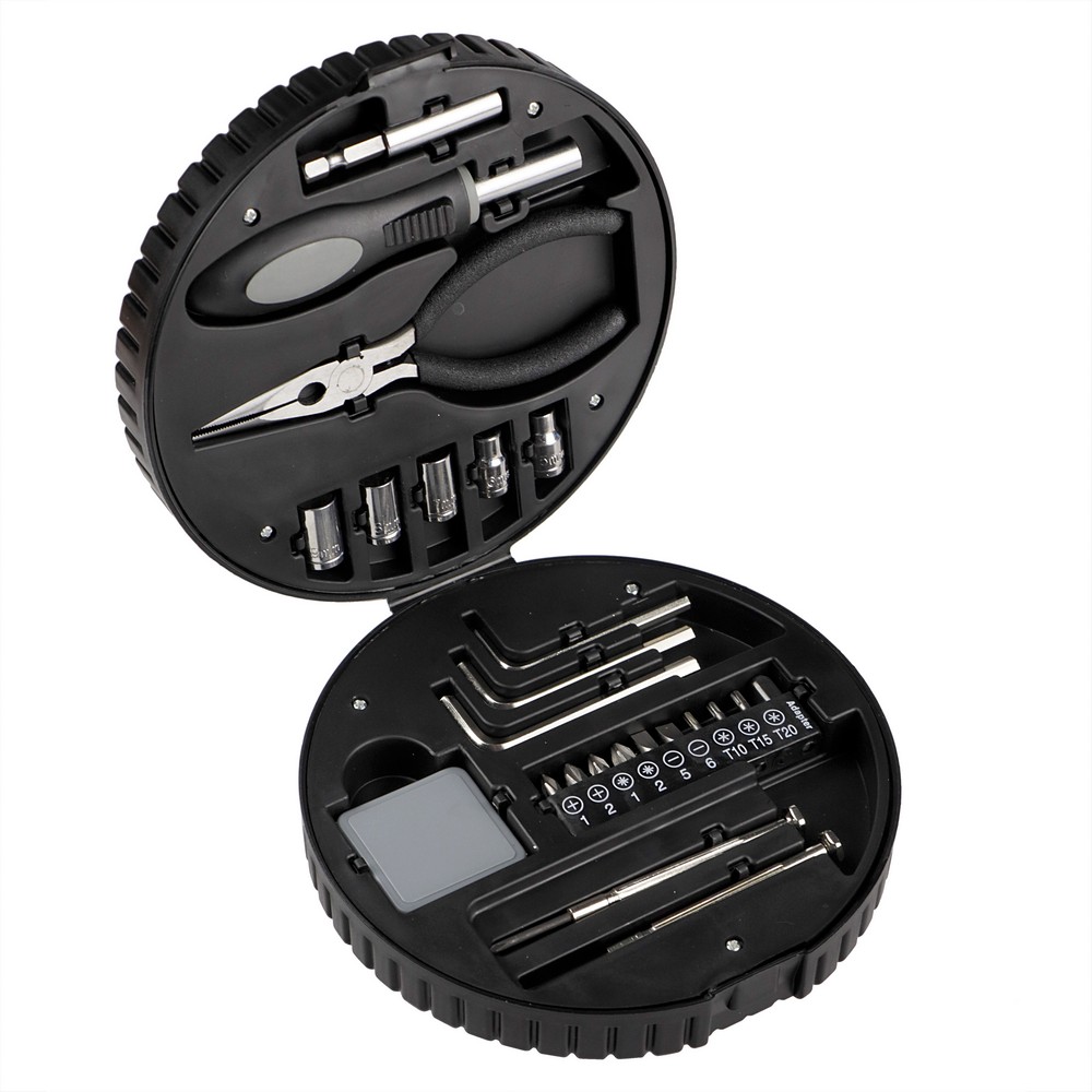 Entdecken Sie das vielseitige Werkzeugset „Oldenburg“ – Ihr unverzichtbarer Begleiter für alle Reparaturen und DIY-Projekte. Dieses 25-teilige Set ist clever in einer reifenförmigen Kassette verpackt und bietet eine kompakte Lösung für unterwegs. Mit einem Durchmesser von 15,8 cm und einem Gewicht von nur 610 g ist es leicht zu transportieren und zu lagern. Hergestellt aus robustem ABS und Metall, garantiert es Langlebigkeit und Zuverlässigkeit. Perfekt für Heimwerker und Profis, die Wert auf Qualität und Funktionalität legen. Ein Muss für jeden Haushalt oder Werkstatt!